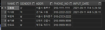 values ('황기쁨','여','강원도 강릉시','010-9999-9999');