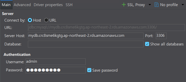 2) RDS 의 connection 정보 입력