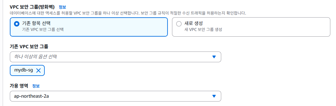 기존 VPC 보안 그룹: 2단계에서 설정한 보안 그룹 선택.