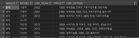 --제조사가 '현대'인 모든 차량의 모델명, 연식, 가격, 옵션을 조회해보자