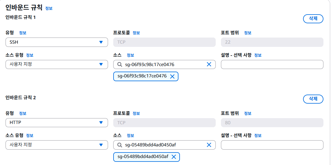 Web Server SG: 80/443 포트 허용(ALB로부터), 22번 포트 허용(Bastion SG로부터).