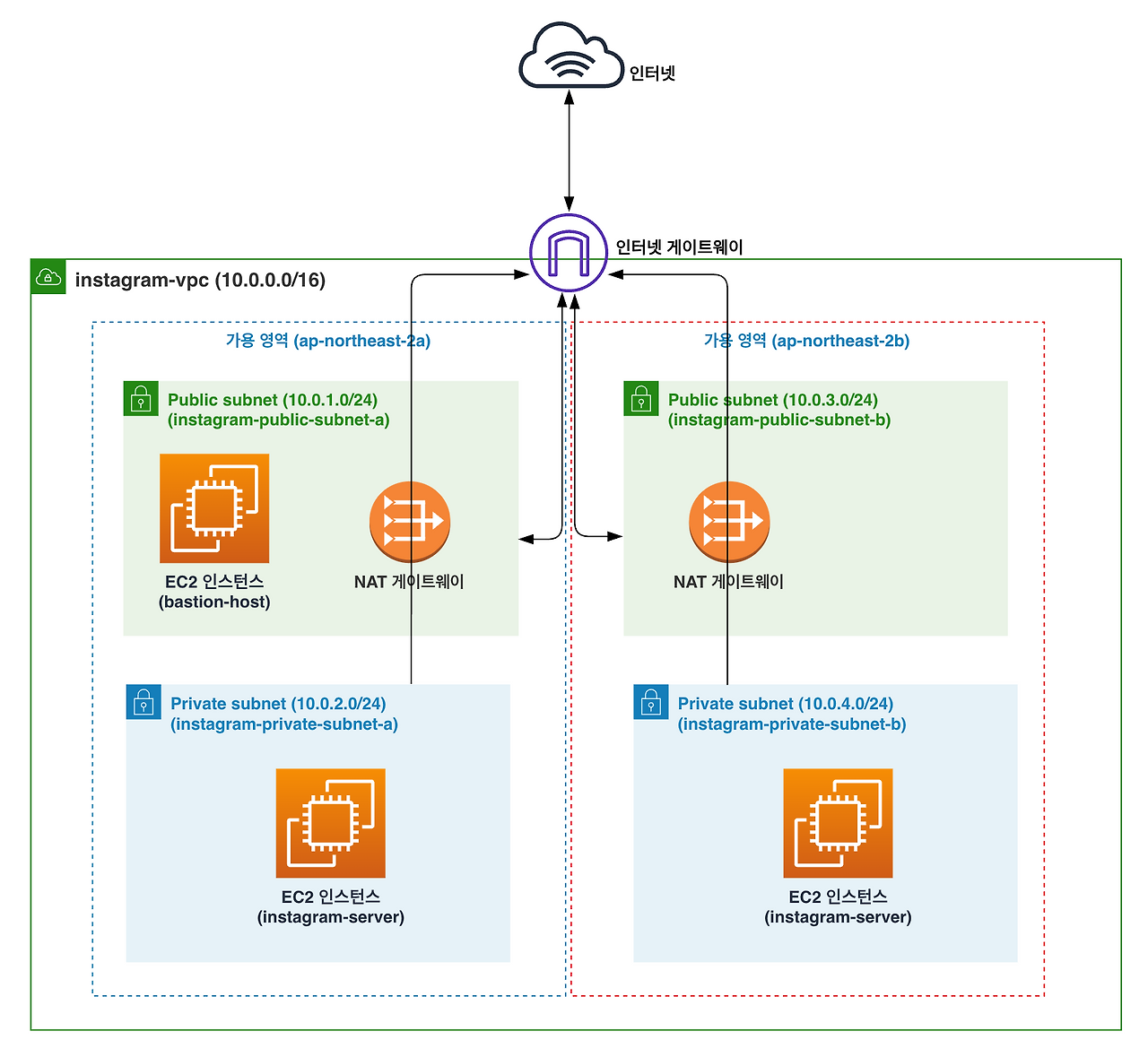 => ex. A 가용영역 : pub - web server / pri - api server, db 일 때, B 가용영역에도 동일하게 세팅하여 운영 안정성 보장