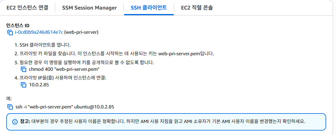 ssh -i "web-pri-server.pem" ec2-user@<프라이빗_서버_사설IP>